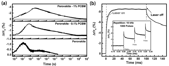 (b).1000Hz激光频率下,钙钛矿-0.1%PCBM器件的积累电阻的时间变化;插图为三个脉冲的图。