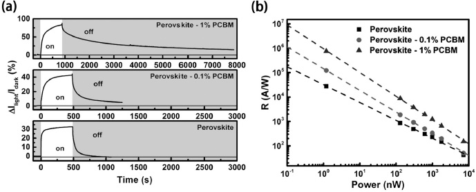 研究者通过在钙钛矿中加入PCBM来改善载流子的传输性能成功的提升了器件的探测性能。研究发现,当加入1%的PCBM时,可以将响应度从3×104提升至8×105A W-1。这项工作表明,少量的电子或空穴受体材料可以有效的提升钙钛矿-石墨烯光电探测器的光响应度。