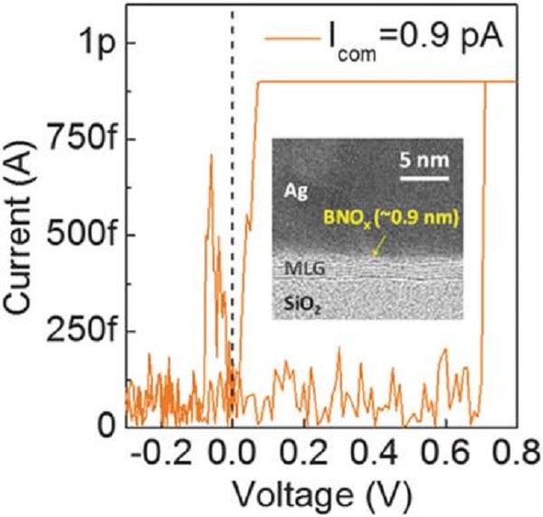 基于氧化氮化硼的忆阻器的电学曲线,工作电流在亚皮安级别。插图是器件的透射电镜照片,先生银电极和石墨烯电极中间的氧化氮化硼介质(BNOx)只有0.9纳米厚。