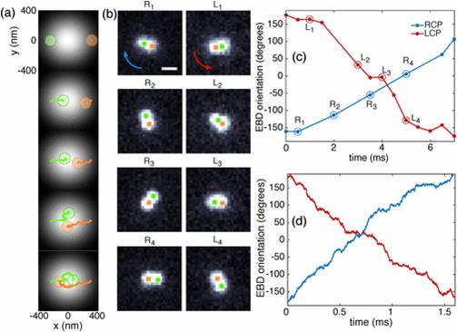 (a) 从ED-LD模拟中获得的两个150 nm直径的Ag纳米粒子轨迹,由右旋聚焦的CP光束照亮。描述近场的EBD的形成和伴随的旋转(实时命令自上而下)模拟中获得的轨迹。背景梯度对事件捕获光束(白色是最高强度)显示了其强度分布。