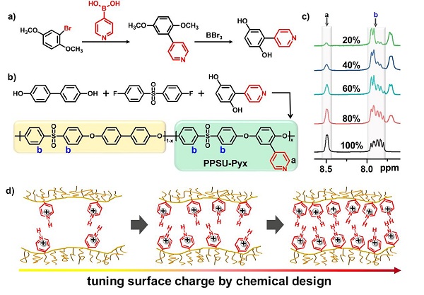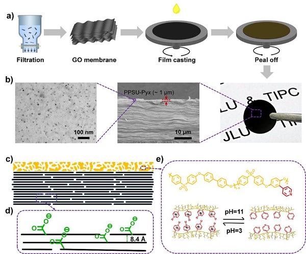 近日,吉林大学化学学院特种工程塑料研究中心的姜振华教授,朱轩伯博士等与中科院理化所江雷研究员及周亚红博士等合作,通过自组装制备了大面积的高强的三维/二维的聚合物/氧化石墨烯的异质多孔膜。通过分子精密设计,将pH响应性的吡啶基团引入双酚单体中,用其制备出一系列具有pH响应性的吡啶联苯聚醚砜(PPSU-Pyx),该聚合物与氧化石墨烯成功开发了一种表现出明显的pH响应离子门控性能的新型聚合物石墨烯异质多孔膜。这一成果以题为“A Charge-Density-Tunable Three/Two Dimensional Polymer/Graphene Oxide Heterogeneous Nanoporous Membrane for Ion Transport”在线发表于ACS NANO上。