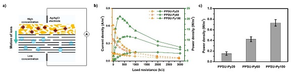 该工作通过分子控制实现了对三维多孔膜孔隙率及电荷密度的调控,多孔膜的孔径基本维持一致,并通过简单的抽滤、旋涂实现了系列异质膜的大面积制备。该系列膜都表现出明显的pH响应离子门控和整流性能,并且该膜在能差发电器件方面有不错的表现,拓宽了功能化特种工程高分子的应用前景,极大提高了多孔膜的实际应用潜力。