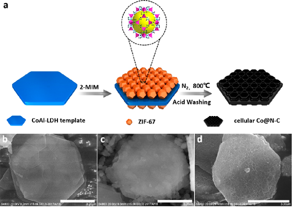 制备的(b)CoAl-LDH模板,(c)CoAl-LDH @ ZIF-67前体和(d)多孔蜂窝状Co @ N-C复合材料的相应SEM图像。