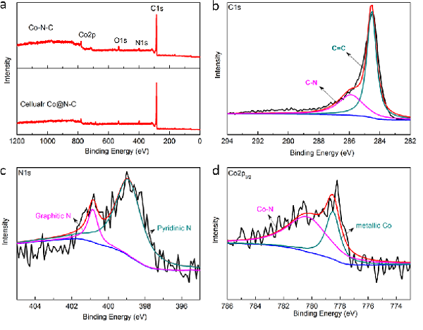 (a)多孔蜂窝状Co @ N-C和Co-N-C复合材料的XPS光谱。