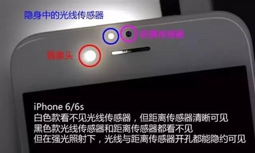 光线传感器和距离传感器一般都是放在一起的,位于手机正面听筒周围,这样就存在一个问题,手机的额头上开了太多洞或黑色长条不太好看,所以苹果一直在想方设法减少开孔、或者隐藏开孔。黑色面板的手机可以轻易隐藏这两个传感器,但白色面板就有点难度了: