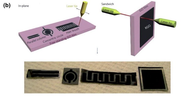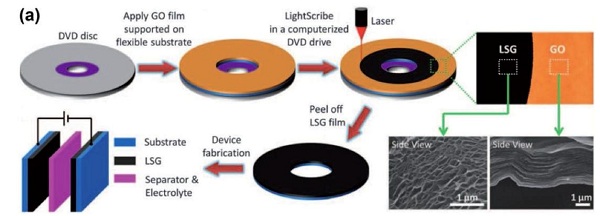 a.激光绘制石墨烯基电化学电容器的制备,利用普通光驱产生的激光还原的rGO表现出了极高的比容量和循环性能。