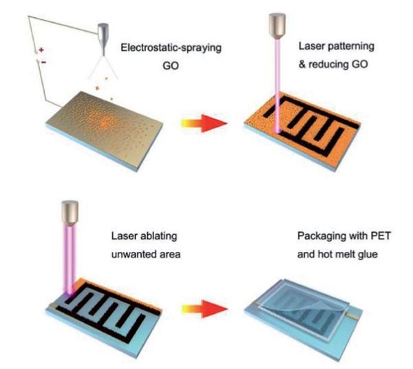 图4 结合静电喷雾和激光技工技术,制备的石墨烯基微型超薄(18mm)的超级电容器