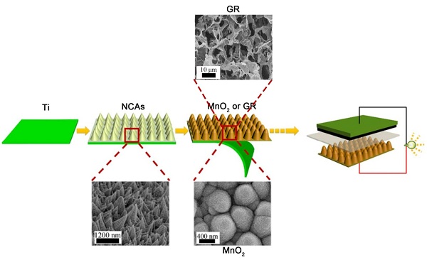 利用电场可以操纵带电粒子定向移动,构建出理想的电极结构。以通过电场操纵生长的三维镍尖锥作为集流体骨架,通过电沉积技术,将二氧化锰或石墨烯负载到镍尖锥上,制备得到柔性、超薄、高性能的超级电容器。