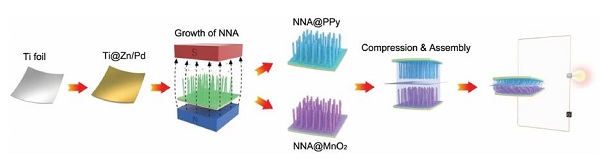 通过磁场诱导合成的超长(长度达1mm)、高度取向镍纳米线阵列。利用其高效的自由电子和离子的输运特性以及金属纳米线的超亲水特性,在上面负载金属氧化物二氧化锰以及导电高分子聚吡咯,装配出拥有高能量密度和优异循环性能的赝电容型非对称超级电容器。