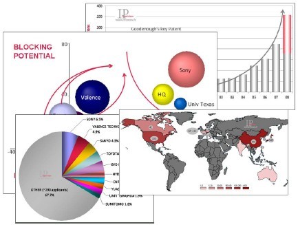 图8. 2010年的金属磷酸锂盐专利情形,涉及的单位有:University of Texas System、Sony、Hydro-Québec、NTT、Valence Technology、Toyota、Sanyo、A123 systems、BYD、Shenzhen BAK battery、Yuasa。