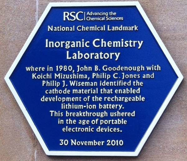 图9. 英国皇家化学会在牛津设立的蓝色牌匾,以纪念在此为可充电电池作出的伟大贡献,古迪纳夫的名字赫然在列,资料来自John B. Goodenough