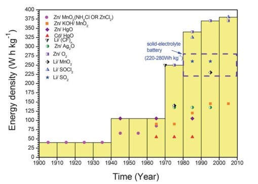 补图3. 1900~2010历史舞台上各类电池的质量能量密度演变,资料来自Thermodynamic analysis on energy densities of batteries。
