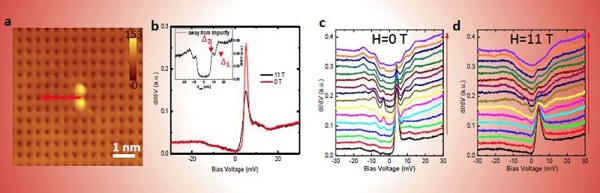 (a)Zn掺杂的铁基超导体(Li1-xFex)OHFe1-yZnySe的表面原子像,一个亮的格点代表一个Se原子,哑铃状的缺陷是Fe位置的杂质;(c)和(d)给出的是在磁场为零和11特斯拉的时候所测量到的扫描隧道谱在空间的变化规律。可以看见在杂质点上面有非常强烈的杂质共振态峰。 (b)显示的是在杂质点上面测量到的磁场为零和11特斯拉的隧道谱,可见峰位置并未随磁场发生移动,说明此杂质是无磁性杂质。