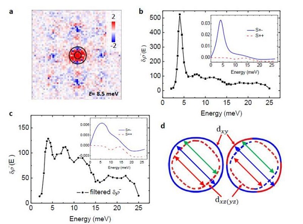 (a)准粒子相干散射图谱经过傅里叶变换以后的强度的实部正负能之差dr-在散射空间的分布情况,他们关心的物理量是两个圆圈内部的积分总和;(b)实验测量到的dr-随能量的变化,插图给出了能隙符号反转(S+-)和符号不反转的(S++)的计算结果。(c)屏蔽掉相干共振峰以后的结果与理论的对比。(b)和(c)中均可见实验结果与S+-理论预期很好符合。(d)根据目前的结果总结的超导能隙情况,能隙符号出现反转,用红色和蓝色各表示不同符号。