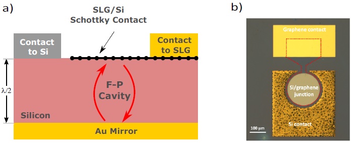 (a).谐振腔增强型(RCE)单层石墨烯(SLG)/硅肖特基光电探测器件截面示意图;