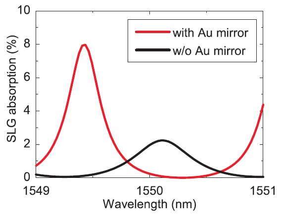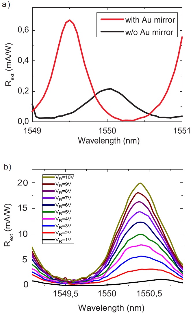(a). 有金镜(红线)与无金镜(黑线)的谐振腔增强型光电探测的响应度曲线;
