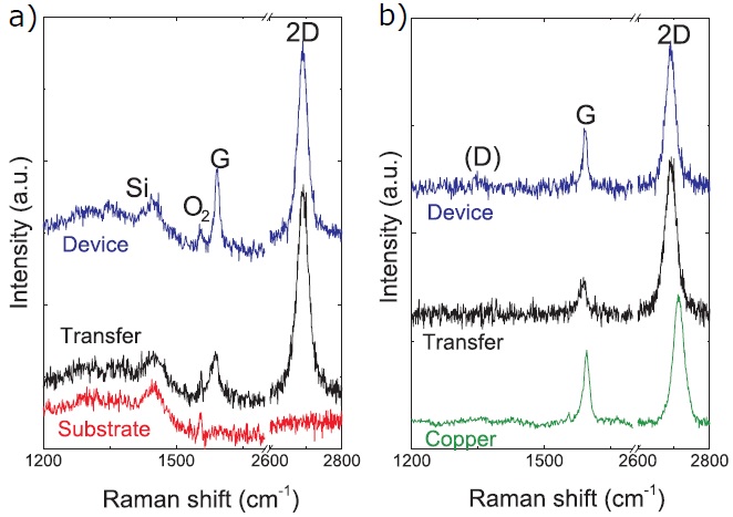 (b). 绿线:刚生长在铜基上的单层石墨烯的拉曼谱;黑线:单层石墨烯转移到硅上的拉曼峰;蓝线:器件完全制备后的拉曼峰。