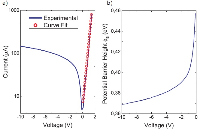(a). SLG/Si 光电探测器件的半对数I-V曲线,实验数据与模拟曲线;