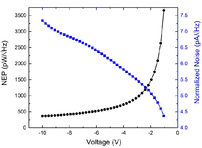 不同反向偏压下的噪声等效功率(黑线)与总噪声电流曲线(蓝线)。