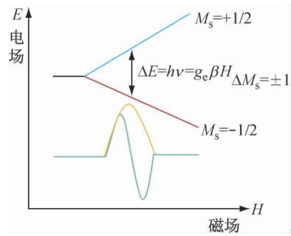 EPR 的基本概念如图 1 所示,物质的顺磁性是由分子的永久磁矩产生的。根据保里原理:每个分子轨道上不能存在 2 个自旋态相同的电子,因而各个轨道上已成对的电子自旋运动产生的磁矩是相互抵消的,只有存在未成对电子的物质才具有永久磁矩,它在外磁场中呈现顺磁性。电子自旋产生自旋磁矩: μ = ge β,其中 β 是玻尔磁子; ge 是无量纲因子,称为 g 因子; 自由电子的 g 因子为 ge = 2.0023,单个电子磁矩在磁场方向分量 μ = ( 1 /2) ge β。当电子自旋处于外磁场H的作用下时,有2个可能的能量状态:即 E =± 1/2( ge βH) ,如图 1 所示,能量差 ΔE = ge β H。这种现象称为塞曼分裂( Zeeman splitting) 。如果在垂直于H 的方向上施加频率为 hυ 的电磁波,当满足下面条件:hυ = ge β H,处于两能级间的电子发生受激跃迁,导致部分处于低能级中的电子吸收电磁波的能量跃迁到高能级中,于是就产生了顺磁共振现象。受激跃迁产生的吸收信号经电子学系统处理可得到 EPR 吸收谱线(对应于图1中虚线),EPR波谱仪记录的吸收信号一般是一次微分线型,或称一次微分谱线( 即测试后得到数据曲线,对应于图 1 中实线)。