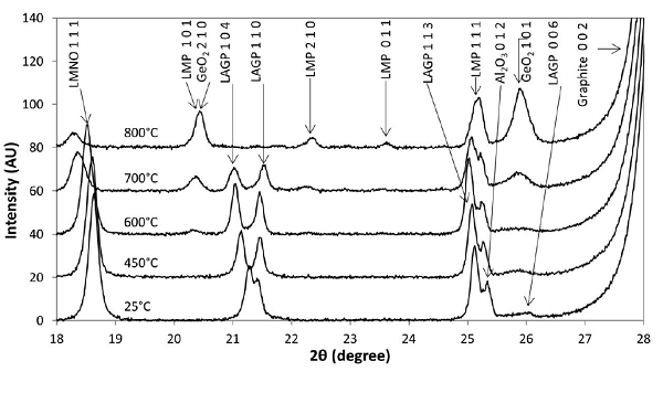 在室温下和在加热到450℃,600℃,700℃和800℃之后,对LAGP和LMNO粉末混合物进行原位XRD扫描