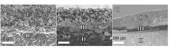 (A-C)在(A)700℃下1小时,(B)750℃下1小时,和(C)800℃下5小时的空气中烧成后的LAGP/LMNO界面SEM显微照片