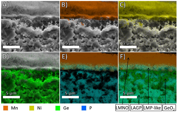 该研究表征了锂离子活性材料LMNO与固体电解质LAGP的反应以检验这些材料加工成全固态锂离子电池的相容性。对于许多全固态电池系统而言,电极-电解质界面的电阻是一个普遍的挑战,并且在LAGP/LMNO系统中增加了氧化物-磷酸盐材料的复杂性以及转换到新相意味着对LAGP/LMNO界面的厚度和接触的明确控制,这对于该系统中的电化学性能是至关重要的。
