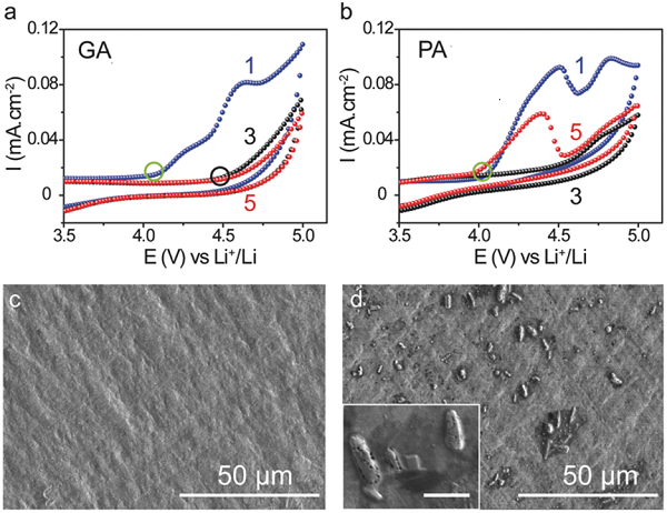 (d) LMO/PA 和LMO/GA电池的充放电曲线,实线和圆圈分别是LMO/PA 和LMO/GA电池;