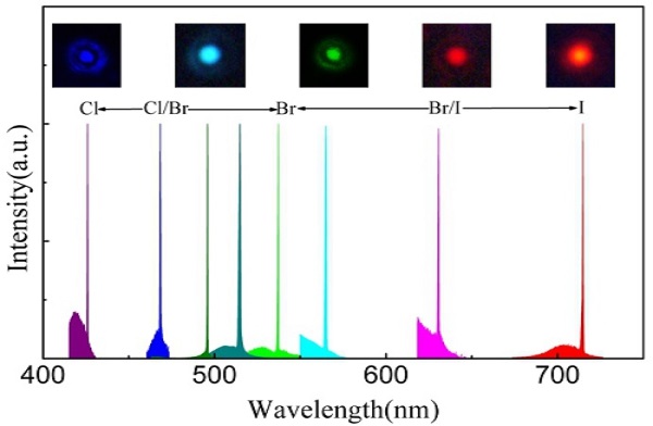 在该项研究中,科研人员基于改进的气相传输冷凝技术,成功制备出了高品质亚微米尺度三维球形钙钛矿谐振腔,球形微腔表面光滑、结构规则、尺寸可控,基于显微荧光拉曼光谱系统对单个谐振腔进行研究,得到了高品质、低阈值、窄带宽的单模激光输出。与同类微型激光器相比,其各项性能(品质因子、线宽、阈值)均处于领先地位,尤其在如此小的微腔模式体积下,单模激光品质因子优于目前报道的自然合成的微纳结构光学谐振腔。更重要的是,研究人员基于钙钛矿的宽带隙可调特性,通过调节卤素配比首次实现了全可见光谱的单模激光可控输出,从理论和实验上对微腔调谐特性进行了分析,阐明其内在物理机制,对于多色纳米激光器的研究以及在激光显示、照明等领域的应用具有重要意义。