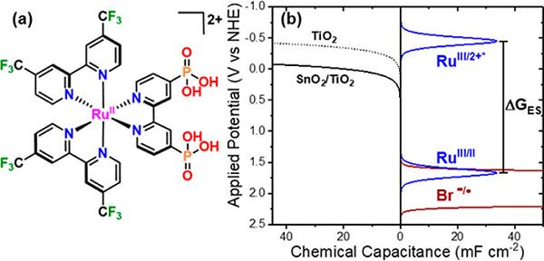 该研究将染料敏化分子过程用于分解HBr,其中具有新型宽光谱吸收的钌多吡啶配合物Ru(btfmb)2P,可实现激发态电子注入以及在酸性水溶液中催化氧化Br–。动力学数据显示在光电化学分解HBr研究中,SnO2/TiO2核−壳介孔薄膜相对于锐钛矿TiO2性能更加优越。上述研究结果有望推进从分子水平上对HBr作为廉价原料用于太阳能燃料的生产进行优化。