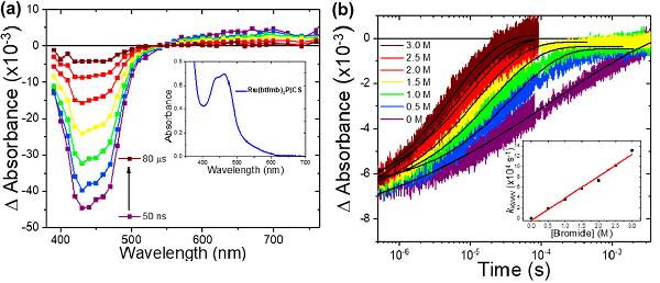 a) 1 N HClO4中,532 nm脉冲光激发Ru(btfmb)2P|CS后50 ns至80 μs间吸收差光谱。内插为基态吸收光谱;