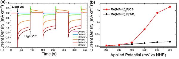 b) Ru(btfmb)2P|CS (红线) and Ru(btfmb)2P|TiO2 (黑线)光照1 min后在不同电势下的电流密度。