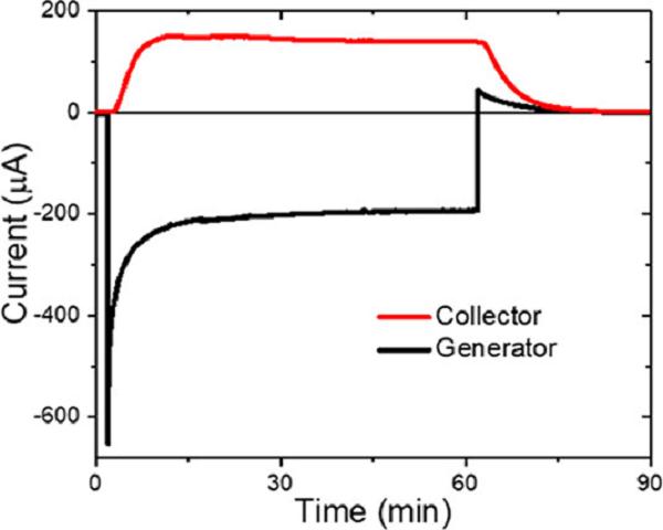 染料敏化Br–氧化发生器(600 mV)和集电极(50 mV)的电流随时间变化曲线