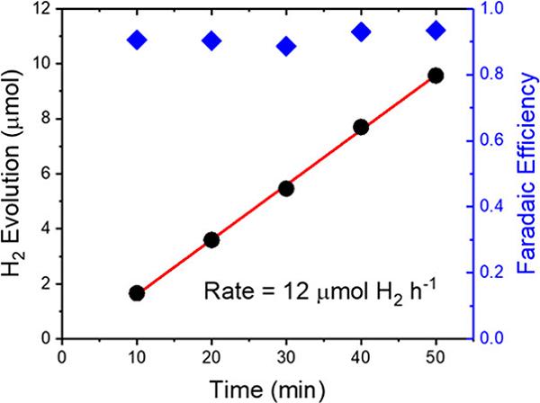 光照一定时间内铂网电极上的氢气产生量以及0.6 V 偏压下Ru(btfmb)2P|CS相应的法拉第效率。