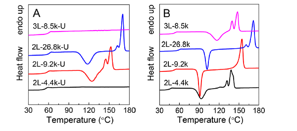 (A,B)记录在熔化的SM-PLLA和PLLA前体的加热过程中的DSC热分析图:(A)SM-PLLA; (B)PLLA前体