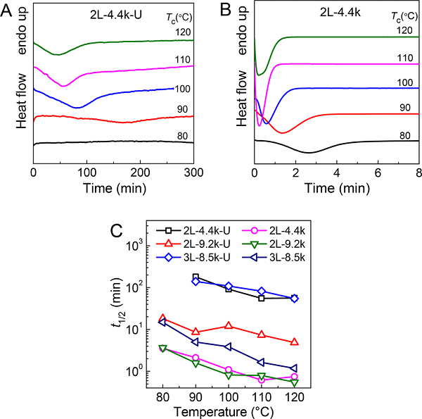 UPy键合的SM-PLLA与传统共价键合PLLA相比表现出独特和不同的结晶动力学,多晶型晶体结构和相变行为。SM-PLLA比相应的共价键合的PLLA前体具有更慢的结晶速率和更低的结晶度,这是由于H键UPy基元的限制作用所引起的。这项研究可以使我们进一步了解SMPs独特的结晶动力学和多晶型晶体结构,也为SMPs在加工过程中的物理性能和功能定制提供了可能的途径。