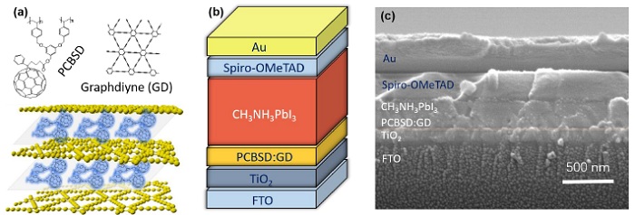 近日,苏州大学廖良生教授、王照奎副教授,中科院化学研究所李玉良院士(共同通讯作者),以及台湾交通大学许千树教授和上海应用物理所高兴宇研究员,在Nano Energy上发表了一篇名为“Graphdiyne-Modified Cross-Linkable Fullerene as an Efficient Electron-Transporting Layer in Organometal Halide Perovskite Solar Cells”的文章。此项工作的第一作者为苏州大学的博士生李萌。研究者报道了一种溶液法制备的基于石墨炔(Graphdiyne)改性热铰链富勒烯(PCBSD)的杂化电子传输层,放置于TiO2与钙钛矿层之中,成功地提升了器件的效率与稳定性。