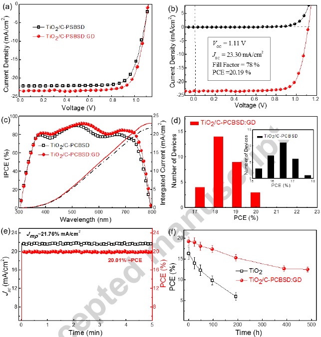(a). 基于TiO2和TiO2/C-PCBSD:GD电子传输层的钙钛矿电池器件的J-V曲线;