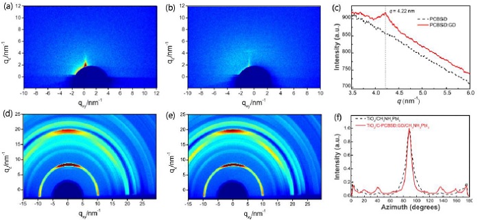 (d-e). 沉积在C-PCBSD和C-PCBSD: GD薄膜上的钙钛矿薄膜的2D GIXRD衍射图纹;