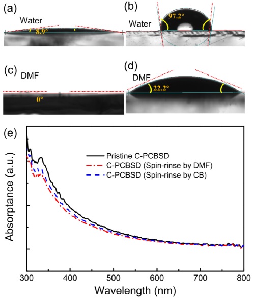 (b, d). 水与DMF在TiO2/C-PCBSD:GD薄膜上的接触角;