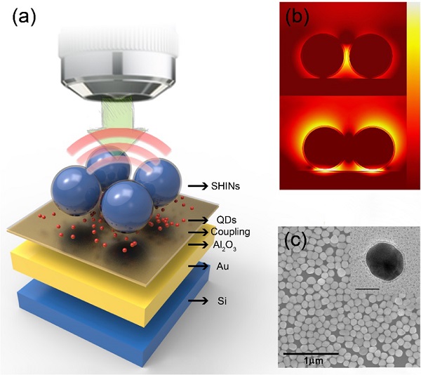 这篇文章介绍了使用SHIN作为为不同半导体量子点薄膜来增强材料的荧光性能,量子点薄膜的发光强度可以提高近1000倍。时间分辨荧光测量和有限元计算表明,这种增强是由于SHIN周围局限的局部光场增加了吸收截面和自发发射率。此外,SHIN还可以通过增加量子点的局部光子态密度,促进更多的电子转移到TiO2中,从而提高量子点敏化TiO2纳米棒的光电化学活性。通过SHIN增强QD薄膜光电性和能量转换效率的方法,有着广阔的应用前景,有待未来进一步发展。