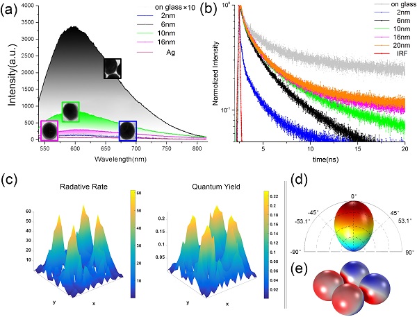 (a) 经不同外壳厚度的纯银纳米颗粒和Ag SHIN改性后CdSe薄膜的等离子体增强荧光光谱;