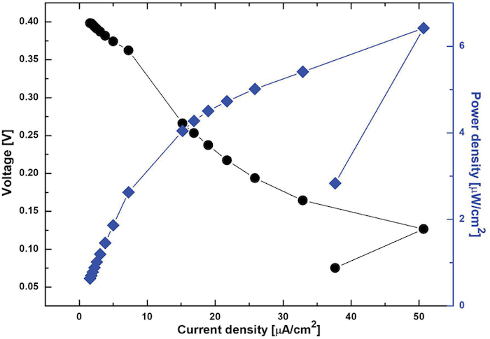 注:小的负极表观面积更有利于PAO1在电极表面均匀分布,从而使电流密度分布均匀并产生最大的功率密度。该图为负极表观面积为0.25 cm2时所得。