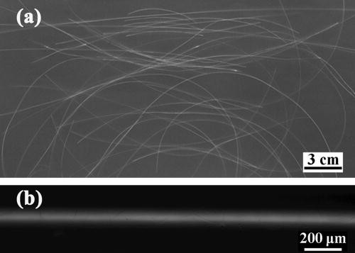(b) Ni-Co-Mn-In变磁形状记忆微丝的光学显微镜照片。由图可知通过泰勒法可以制备尺寸均匀的微丝。