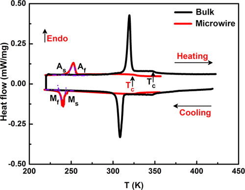 图为Ni-Co-Mn-In变磁形状记忆微丝及其对应块体的DSC曲线。由图可知与块体相比,微丝的磁结构转变温度(As、Af、Ms和Mf)及奥氏体的居里温度(Tc)均降低。