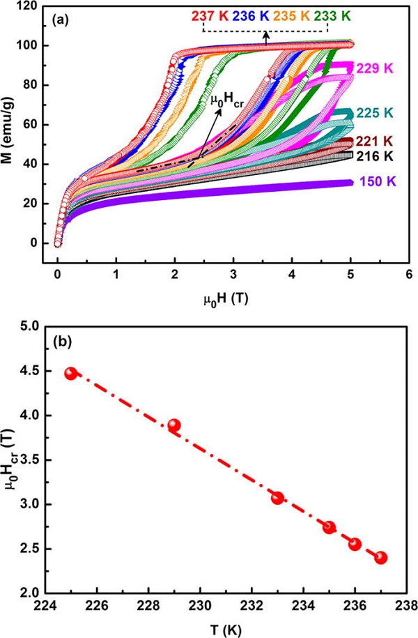 (b) 磁致相变的临界磁场μ0Hcr与温度的关系图。通过拟合发现其斜率约为-0.175 T/K。