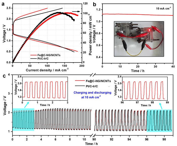 图4(a)Fe@C-NG/NCNTs和Pt/C+Ir/C组装电池的放电曲线和对应的功率密度曲线;(b) Fe@C-NG/NCNTs在10 mA cm-2条件下的恒流放电平台,插图为点灯照片;(c)Fe@C-NG/NCNTs和Pt/C+Ir/C电极在10 mA cm-2条件下的充放电循环稳定性