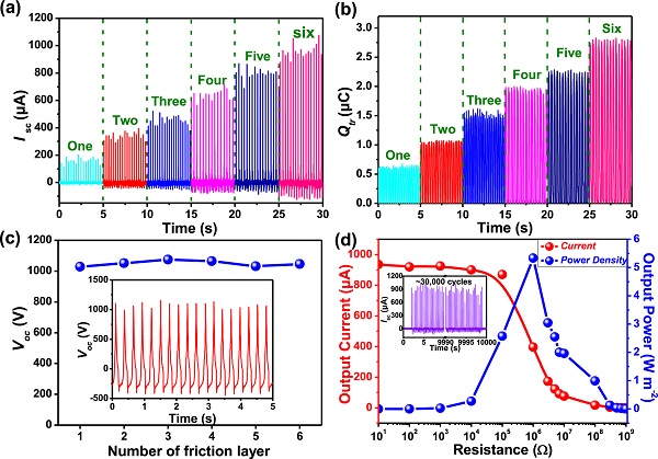 (d) 含6个摩擦层TENG的输出电流和功率密度随负载电阻变化,插图是经30000个循环后的最大短路电流。