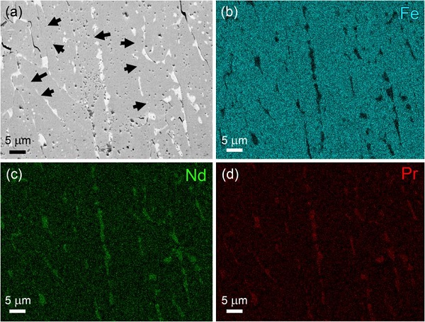 b) 相对应的铁,c) 钕,和d) 镨的元素分布图