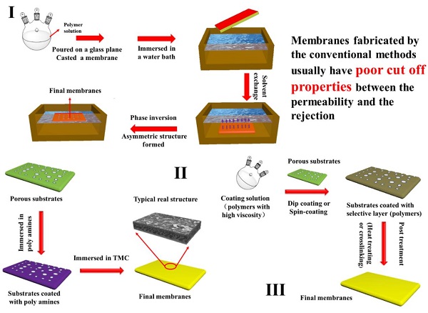 图2.传统超滤/纳滤膜制备方法(I) 相转化, (II) 界面聚合 (III) 表面涂覆